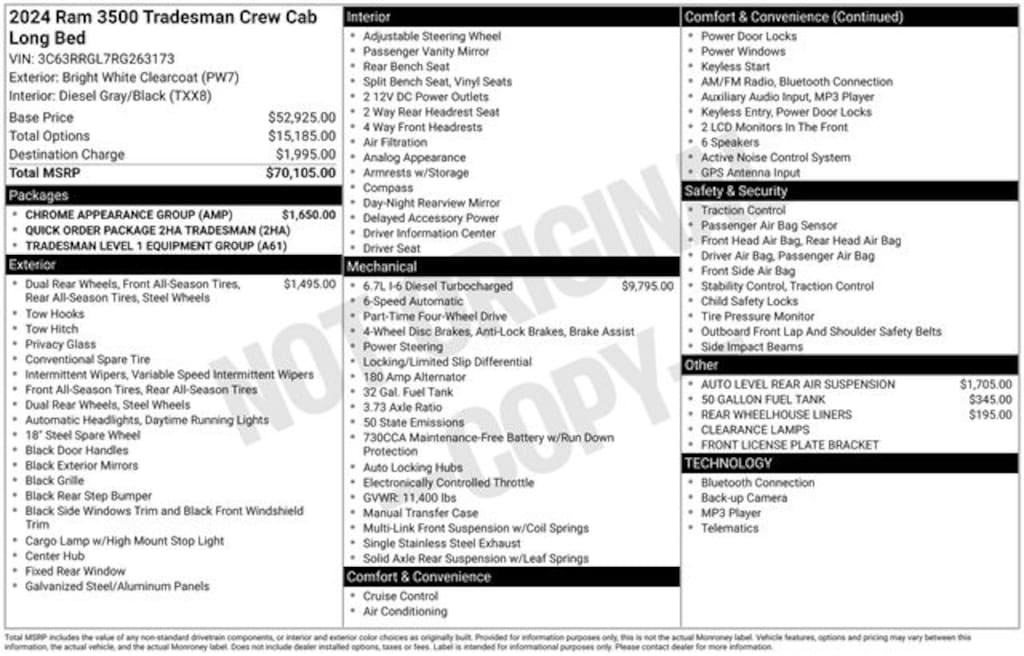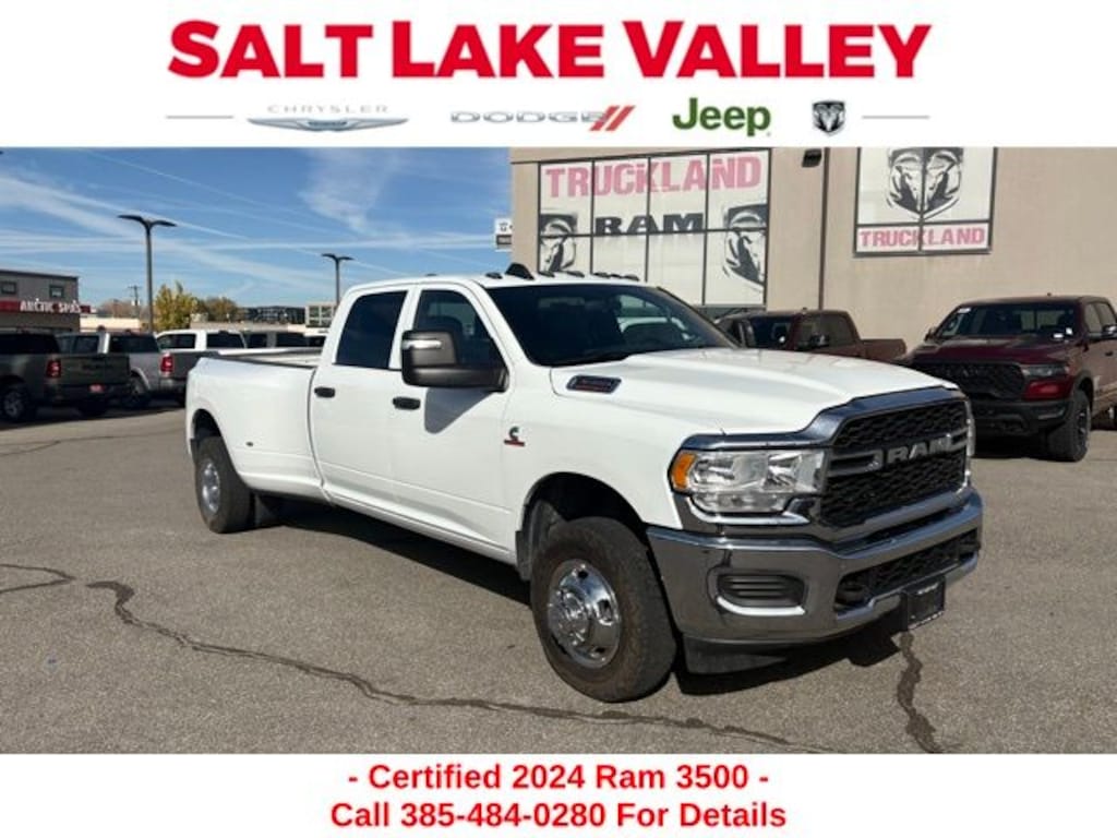 Get ready to hit the road in this Ram 3500, a standout choice for drivers looking for reliability, performance, and style! This impressive vehicle is packed with premium features designed to make every drive more enjoyable. Plus, youâll enjoy a $1,000 finance savings, already included in the sale price, when you finance through one of our trusted lending partners. Whether youâre searching for used cars in Salt Lake City, a dependable SUV, or a powerful truck, this Ram 3500 delivers everything you need and more. Visit Salt Lake Valley Chrysler Dodge Jeep Ram today to test drive or explore our entire selection of quality pre-owned vehicles. Donât wait - shop online at www.slvcdjr.com or call 801-484-8755 to learn more! This amazing vehicle comes loaded with options like Chrome Appearance Group (Bright Front Bumper, Bright Rear Bumper, Bright Wheel Skins, Center Hub, Chrome Grille Surround, Chrome Headlamp Bezels, and Matte Black Mesh w/Chrome Grille), Quick Order Package 2HA Tradesman, Tradesman Level 1 Equipment Group, 2 Way Rear Headrest Seat, 3.73 Axle Ratio, 4 Way Front Headrests, 4-Wheel Disc Brakes, 40/20/40 Split Bench Seat, 50 Gallon Fuel Tank, 6 Speakers, 6000# Front Axle w/Hub Ext, ABS brakes, Active Noise Control System, Air Conditioning, AM/FM radio, Auto Level Rear Air Suspension, Black Exterior Mirrors, Box & Rear Fender Clearance Lamps, Brake assist, Clearance Lamps, Compass, Delay-off headlights, Driver door bin, Dual front impact airbags, Dual front side impact airbags, Dual Rear Wheels, Electronic Stability Control, Electronically Controlled Throttle, Emergency communication system: SiriusXM Guardian, For Details Visit DriveUconnect.com, Front anti-roll bar, Front Armrest w/Cupholders, Front Center Armrest w/Storage, Front License Plate Bracket, Front reading lights, Fully automatic headlights, Global Telematics Box Module (TBM), GPS Antenna Input, HD Vinyl 40/20/40 Split Bench Seat, Illuminated entry, Integrated Voice Command w/Bluetooth, Low tire pressure warning, Manual Adjust 4-Way Driver Seat, Manual Adjust 4-Way Front Passenger Seat, Manual Folding Exterior Mirrors, Manual Telescoping Mirrors, Occupant sensing airbag, Outside temperature display, Overhead airbag, Overhead console, Panic alarm, ParkView Rear Back-Up Camera, Passenger door bin, Passenger vanity mirror, Power steering, Power windows, Radio data system, Radio: Uconnect 3 w/5" Display, Rear Folding Seat, Rear step bumper, Rear Wheelhouse Liners, Remote keyless entry, Remote USB Port - Charge Only, Speed control, Storage Tray, Tachometer, Tilt steering wheel, Tip Start, Traction control, Trailer Brake Control, Trailer Light Check, Variably intermittent wipers, Voltmeter, Wheels: 17" x 6.0" Steel Argent, Wheels: 17" x 6.0" Steel Chrome Clad, and Wheels: 18" x 8.0" Steel, making it the perfect choice for your next adventure.