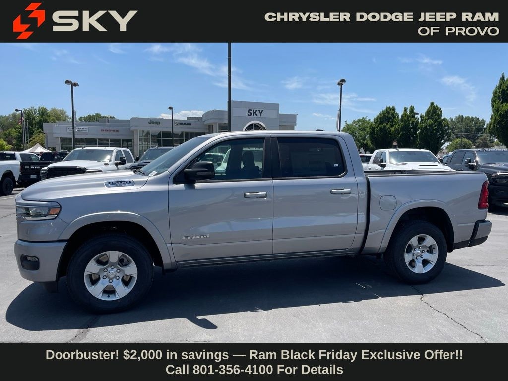 Big Horn Level 1 Equipment Group (115V Auxiliary Power Outlet, 2nd Row In Floor Storage Bins, 400W Inverter, Auto Power-Folding Mirrors, Auto-Dimming Exterior Driver Mirror, Auto-Dimming Rear-View Mirror, Black Exterior Mirrors, Black Premium Power Mirrors, Convex Wide-Angle Exterior Mirror Insert, Exterior Mirrors Courtesy Lamps, Exterior Mirrors w/Heating Element, Exterior Mirrors w/Supplemental Signals, Glove Box Lamp, Heated Front Seats, Heated Steering Wheel, Leather Wrapped Steering Wheel, Power 2-Way Driver Lumbar Adjust, Power Adjust 8-Way Driver Seat, Power Adjustable Pedals, Rear Power Sliding Window, Rear Window Defroster, Steering Wheel Mounted Audio Controls, Sun Visors w/Illuminated Vanity Mirrors, and Universal Garage Door Opener), Quick Order Package 21Z Big Horn, Sport Appearance Package (3 Rear Seat Head Restraints, 4 Way Front Headrests, Black Interior Accents, Body Color Door Handles, Body Color Front Bumper, Body Color Rear Bumper w/Step Pads, Body Color Tailgate Handle, Bucket Seats, Deluxe Cloth Bucket Seats, Front Seat Back Map Pockets, Full Length Floor Console, Grille Surround 1 Body Color Texture 1 Black, Manual Adjust 4-Way Front Passenger Seat, RAM Grille Badge - Chrome, Rear 60/40 Folding Seat, and Rear Center Armrest), 33 Gallon Fuel Tank, 4-Wheel Disc Brakes, 4G LTE Wi-Fi Hot Spot, 6 Speakers, ABS brakes, Air Conditioning, Alloy wheels, AM/FM radio, Apple CarPlay/Android Auto, Auto High-beam Headlights, Brake assist, Bumpers: chrome, Cloth Bench Seat, Compass, Connectivity - US/Canada, Delay-off headlights, Driver door bin, Dual front impact airbags, Dual front side impact airbags, Electronic Stability Control, Front anti-roll bar, Front Center Armrest w/Storage, Front fog lights, Front License Plate Bracket, Front reading lights, Front wheel independent suspension, Fully automatic headlights, GPS Antenna Input, Heated door mirrors, Illuminated entry, Integrated Voice Command w/Bluetooth, Low tire pressure warning, Manual Folding Exterior Mirrors, Manufacturer's Statement of Origin, MOPAR Front & Rear Rubber Floor Mats, Occupant sensing airbag, Outside temperature display, Overhead airbag, Overhead console, Panic alarm, ParkView Rear Back-Up Camera, Passenger door bin, Passenger vanity mirror, Power door mirrors, Power steering, Power windows, Radio data system, Radio: Uconnect 5 W w/8.4" Display, Rear anti-roll bar, Rear seat center armrest, Rear step bumper, Remote keyless entry, Speed control, Split folding rear seat, Supplier Part Tracking (J-1), Tachometer, Telescoping steering wheel, Tilt steering wheel, Traction control, Trailer Brake Control, Trip computer, USB Host Flip, Variably intermittent wipers, Voltmeter, and Wheels: 18" x 8" Cast-Aluminum Painted. Price may include: 10% Msrp - 2025 National 10% Below MSRP . Exp. 12/01/2025 ...$2,000 Select Inventory Bonus Cash May not be combined with some offers. Residency restrictions apply see dealer for details $1,500 trade in allowance program for customers that own a 2018 or newer passenger car or truck with less than 80,000 miles and trade in their vehicle towards the purchase of a new vehicle. Some restrictions may apply. Contact dealer for details. $2,000 Down Payment Assistance. Must Finance with CCAP. May not be combined with some factory incentives. Contact dealer for details.