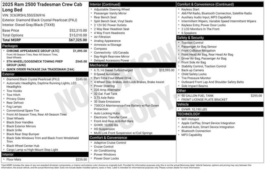 --- Please note that the final selling price does not include tax, tag, title, documentation fees, dealer-installed options, or pricing adjustments due to market demand. Financing through Chrysler Capital is required for all discounts to be applied. Special finance offers may not be combined with some factory incentives. While we strive for accuracy, errors may occur, so please verify all information with a customer service representative. For the most accurate pricing, call us at (801) 484-8775 or visit our dealership in person. Prices and payments are subject to change based on manufacturer incentives. Price may include: $2000 - 2025 National Bonus Cash . Exp. 12/01/2025 ...$2,000 Select Inventory Bonus Cash May not be combined with some offers. Residency restrictions apply see dealer for details ... Sales price includes $1,500 Conditional Ram finance discount. You must finance or lease with Salt Lake Valley CDJR through Chrysler Capital to obtain the $1,500 finance discount. Factory subsidized interest rate loans are not eligible. If you do not finance or lease with Chrysler Capital, then you are not eligible for the $1,500 finance discount and your sale price will increase by $1,500. Some restrictions may apply. Contact dealer for details... ..Sale price includes $1,500 trade in allowance program for customers that own a 2019 or newer passenger car or truck with 100,000 miles or less and trade it towards the purchase of an eligible new 2024 â" 2025 Chrysler, Dodge, Jeep, Ram. Branded/Salvage title will not qualify. Contact dealer for details...