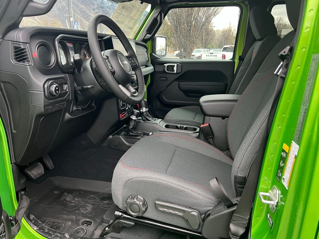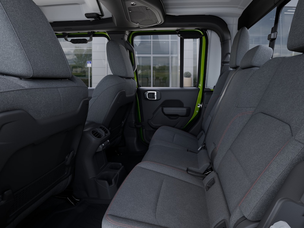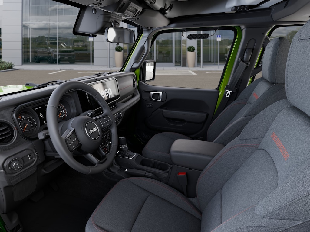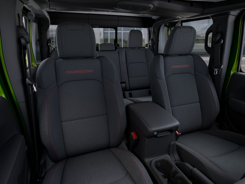 Convenience Group (Heated Front Seats, Heated Steering Wheel, Remote Start System, and Universal Garage Door Opener), Quick Order Package 24R Rubicon, Steel Power Dome Hood Package (Power Dome Dual Vented Hood), 110 Mph Vehicle Max Speed Calibration, 12.3" Touchscreen Display, 4-Wheel Disc Brakes, 4.10 Rear Axle Ratio, 4G LTE Wi-Fi Hot Spot, 8 Speakers, ABS brakes, Air Conditioning, Alexa Built-in, Alloy wheels, AM/FM radio: SiriusXM with 360L, Apple CarPlay, Apple CarPlay/Android Auto, Automatic temperature control, Black 3-Piece Hard Top, Brake assist, Cloth Low-Back Bucket Seats, Compass, Connectivity - US/Canada, Delay-off headlights, Driver door bin, Driver vanity mirror, Dual front impact airbags, Dual front side impact airbags, Electronic Stability Control, Emergency communication system: Jeep Connect, Freedom Panel Storage Bag, Front anti-roll bar, Front Bucket Seats, Front Center Armrest w/Storage, Front dual zone A/C, Front fog lights, Front License Plate Bracket, Front reading lights, Fully automatic headlights, Google Android Auto, Heated door mirrors, Illuminated entry, Integrated roll-over protection, Low tire pressure warning, MOPAR All-Weather Slush Mats, MOPAR Spray in Bedliner, Occupant sensing airbag, Outside temperature display, Overhead airbag, Panic alarm, Passenger door bin, Passenger vanity mirror, Performance Suspension, Power door mirrors, Power steering, Power windows, Radio data system, Radio: Uconnect 5 with 12.3" Display, Rear anti-roll bar, Rear reading lights, Rear Sliding Window, Rear Window Defroster, Remote keyless entry, Security system, Speed control, Split folding rear seat, Steering wheel mounted audio controls, Tachometer, Telescoping steering wheel, Tilt steering wheel, Traction control, Trip computer, USB Host Flip, Variably intermittent wipers, Voltmeter, and Wheels: 17" x 7.5" Machined/Painted Black. $1,500 trade in allowance program for customers that own a 2018 or newer passenger car or truck with less than 80,000 miles and trade in their vehicle towards the purchase of a new vehicle. Some restrictions may apply. Contact dealer for details. ...Sale price includes a $2,000 conditional finance discount. To qualify, customer must finance or lease through Chrysler Capital. Factory-subsidized interest rate loans are not eligible. If customer does not finance or lease through Chrysler Capital, the $2,000 finance discount will not apply and sale price will increase by $2,000. Some restrictions may apply. See dealer for details.