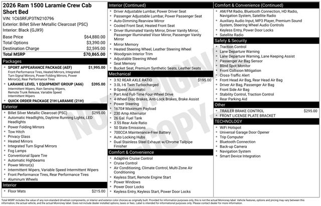 Get the job done and have fun doing it with the new Ram 1500 from Salt Lake Valley CDJR! Power, durability, and innovation come together in every Ram truck. Whether youâre working hard or exploring Utahâs backroads, the 1500 is built to handle it all. Call us today at 801-484-8755 to schedule a time to check it out! 2026 Ram 1500 Laramie Billet Silver Metallic Clearcoat 3.0L I6