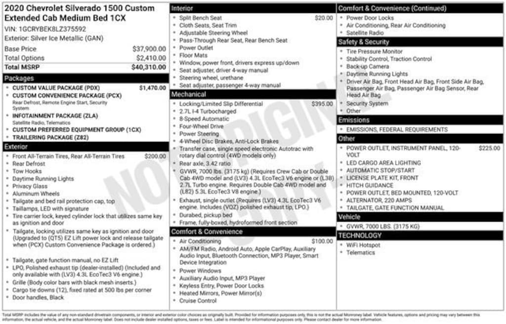 Turn every drive into something special with this Chevrolet Silverado 1500 from Salt Lake Valley Chevrolet! Designed for comfort, performance, and style, this vehicle comes fully equipped with modern technology and convenience features youâll love. Plus, enjoy a $1,000 finance savings, already included in the sale price, when you finance through one of our trusted lending partners. If youâre shopping for used cars in Salt Lake City, or searching for the perfect SUV, truck, or sedan, this Chevrolet Silverado 1500 delivers the dependability and value youâre looking for. Itâs the ideal match for your lifestyle - ready for everything from mountain adventures to city commutes. Visit Salt Lake Valley Chevrolet today and see why so many Utah drivers trust us for great deals on quality pre-owned vehicles. Explore our inventory online at www.slvchevy.com or call 801-969-8221 to schedule your test drive today! This impressive vehicle includes Custom Convenience Package (Electric Rear-Window Defogger, EZ Lift Power Lock & Release Tailgate, LED Cargo Area Lighting, Remote Vehicle Starter System, and Theft Deterrent System (Unauthorized Entry)), Custom Value Package, Infotainment Package (4G LTE Wi-Fi Hot Spot Capable, Chevrolet Connected Access Capable, Compass, OnStar & Chevrolet Connected Services Capable, and SiriusXM Radio), Preferred Equipment Group 1CX (170 Amps Alternator, 3.5 Diagonal Monochromatic Display, Bluetooth® For Phone, Body Color Grille, Color-Keyed Carpeting Floor Covering, Deep-Tinted Glass, Front Frame-Mounted Black Recovery Hooks, Front Rubberized Vinyl Floor Mats, Locking Tailgate, Manual Tilt-Wheel Steering Column, Power Door Locks, Power Front Windows w/Driver Express Up/Down, Power Front Windows w/Passenger Express Down, Power Rear Windows w/Express Down, Rear 60/40 Folding Bench Seat (Folds Up), Rear Rubberized-Vinyl Floor Mats, Remote Keyless Entry, and Steering Wheel Mounted Electronic Cruise Control), Trailering Package (Hitch Guidance), 120-Volt Bed Mounted Power Outlet, 120-Volt Instrument Panel Power Outlet, 220 Amps Alternator, 3.42 Rear Axle Ratio, 4-Wheel Disc Brakes, 40/20/40 Front Split Bench Seat, 6 Speakers, ABS brakes, Air Conditioning, Alloy wheels, Apple CarPlay/Android Auto, Automatic Stop/Start, Brake assist, Bumpers: body-color, Cloth Seat Trim, Delay-off headlights, Driver door bin, Driver vanity mirror, Dual front impact airbags, Dual front side impact airbags, Electronic Stability Control, Exterior Parking Camera Rear, Front 40/20/40 Split-Bench Seat, Front anti-roll bar, Front Center Armrest, Front License Plate Kit, Front reading lights, Front wheel independent suspension, Fully automatic headlights, Heated door mirrors, Heavy Duty Suspension, Heavy-Duty Rear Locking Differential, Illuminated entry, Low tire pressure warning, Occupant sensing airbag, Outside temperature display, Overhead airbag, Overhead console, Panic alarm, Passenger door bin, Passenger vanity mirror, Polished Exhaust Tip, Power door mirrors, Power steering, Power windows, Radio data system, Radio: Chevrolet Infotainment 3 System, Rear reading lights, Rear step bumper, Remote keyless entry, Single-Zone Manual/Semi-Automatic Air Conditioning, Speed control, Speed-sensing steering, Split folding rear seat, Tachometer, Tilt steering wheel, Traction control, Trip computer, Variably intermittent wipers, Voltmeter, and Wheels: 20 x 9 Bright Silver Painted Aluminum, offering everything you need for your next adventure.
