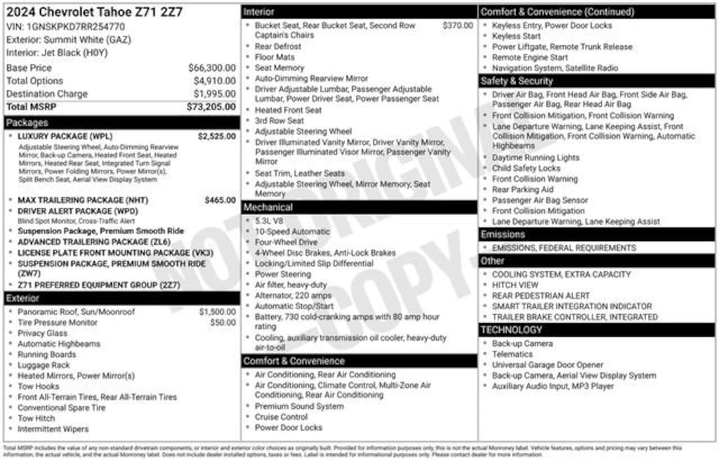 Take your drives to the next level with this Chevrolet Tahoe from Salt Lake Valley Buick GMC! Engineered for a smooth ride, advanced convenience, and lasting dependability, this vehicle is ready to handle everything your day throws at you. Plus, enjoy a $1,000 finance savings, already included in the sale price, when you finance through one of our trusted lending partners. Looking for quality used cars in Salt Lake City? This Chevrolet Tahoe delivers style, versatility, and value - perfect for daily commutes, family trips, or weekend adventures. Stop by Salt Lake Valley Buick GMC to see this vehicle in person and explore our wide selection of pre-owned cars, trucks, and SUVs. Browse online at www.slvbuickgmc.com or call 801-265-1511 to schedule your test drive today! With Advanced Trailering Package (Hitch View w/Pan/Zoom Image Adjustment, Integrated Trailer Brake Controller, and Smart Trailer Integration Indicator), Driver Alert Package (Lane Change Alert w/Side Blind Zone Alert and Rear Cross Traffic Alert), License Plate Front Mounting Package, Luxury Package (2nd Row Pwr Release 60/40 Split-Folding Bench Seat, 3rd Row 60/40 Power-Folding Split-Bench Seat, HD Surround Vision, Heated 2nd Row Outboard Seats, Heated Steering Wheel, Memory Settings, Outside Heated Power-Adjustable Mirrors, Power Tilt & Telescopic Steering Column, and Rear Pedestrian Alert), Max Trailering Package (Extra Capacity Cooling System), Preferred Equipment Group 2Z7 (1st & 2nd Row Color-Keyed Carpeted Floor Mats, 2-Speed Active Electronic AutoTrac Transfer Case, Auto-Dimming Inside Rear-View Mirror, Black Tubular Assist Steps, Bose 9-Speaker Stereo Audio System Feature, Bright Front & Rear Door Sill Plates, Color-Keyed Carpeting Floor Covering, Driver & Front Outboard Passenger Airbags, Enhanced Driver Information Center, Floor Console w/Storage Area, Front High-Approach Angle Fascia, Hands-Free Rear Power Programmable Liftgate, Hill Descent Control, LED Daytime Running Lamps, Memory Settings for Driver, Red Horizontal-Mounted Recovery Hooks, Remote Start, SiriusXM w/360L, Universal Home Remote, Wireless Charging, and Wrapped Steering Wheel), 10-Way Power Driver & Passenger Seat Adjusters, 3.23 Rear Axle Ratio, 3rd row seats: split-bench, 4-Wheel Disc Brakes, 9 Speakers, ABS brakes, Air Conditioning, Alloy wheels, AM/FM radio: SiriusXM with 360L, Apple CarPlay/Android Auto, Auto High-beam Headlights, Auto-dimming Rear-View mirror, Automatic temperature control, Brake assist, Bumpers: body-color, Compass, Delay-off headlights, Driver door bin, Driver vanity mirror, Dual front impact airbags, Dual front side impact airbags, Dual-Pane Power Panoramic Sunroof, Electronic Stability Control, Emergency communication system: OnStar and Chevrolet connected services capable, Four wheel independent suspension, Front anti-roll bar, Front Bucket Seats, Front Center Armrest, Front dual zone A/C, Front High-Back Reclining Bucket Seats, Front reading lights, Fully automatic headlights, Garage door transmitter, Heated door mirrors, Heated Driver & Front Passenger Seats, Heated front seats, Illuminated entry, Infotainment Display, Leather-Appointed Seat Trim, Low tire pressure warning, Memory seat, Navigation System, Occupant sensing airbag, Outside temperature display, Overhead airbag, Overhead console, Panic alarm, Passenger door bin, Passenger vanity mirror, Power door mirrors, Power driver seat, Power Liftgate, Power passenger seat, Power Release 2nd Row Bucket Seats, Power steering, Power windows, Premium audio system: Chevrolet Infotainment 3 Premium, Premium Smooth Ride Suspension, Radio: Chevrolet Infotainment 3 Premium System, Rain sensing wipers, Rear air conditioning, Rear anti-roll bar, Rear reading lights, Rear seat center armrest, Rear window defroster, Rear window wiper, Remote keyless entry, Roof rack: xxxxxx, Security system, Speed control, Speed-sensing steering, Split folding rear seat, Spoiler, Steering wheel mounted audio controls, Tachometer, Teles
