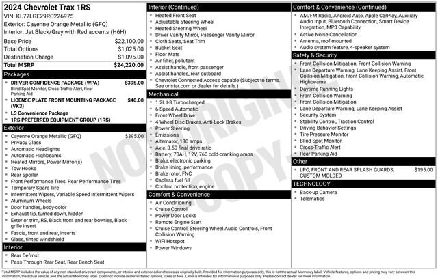 I have a 2024 2RS with the moonroof and wireless charging. The flat bottom steering wheel is extra nice when you get in or get out of the car, especially if you are a big person, like me. It gets great gas mileage, and it has plenty of power, contrary to what you may have heard. The golden yellow turns heads, and most are surprised, like I was, at the low price, considering it has heated seats, heated steering wheel, wireless charging, moonroof like cars which costs tens of thousands of dollars more. Safety: This is a big deal. It has blind spot monitor, adaptive Cruise control and these things make it safer to drive. The backup camera has dynamic lines showing you the approximate path of where you are going when backing up. The backup camera is fabutastic with great colors, dynamic lines and a large screen. My car has almost 4000 miles and my wife loves it. She never has any problem finding the car in a sea of thousands of cars in a parking lot, because the gold color sticks out for miles. Now, the bad: No car is perfect. This is no exception. The engine noise, with the small turbo, is more than I would like. I guess the worst part is that its "not a buick" and does not have a buick ride. Buick does make a "Trax" with its upgrades and calls it an Encore. If you are a "smooth ride affectionado" and are willing to pay more, I would recommend the Buick instead. For most people, tho, who want a new car under between 21,000 and 26,000, the Trax is the best bet. Its much larger than the Nissan Kicks, which is in a similar price range. I have previously driven a Honda CRV hybrid, but when Honda raised the price of a similar equipped (SEL) CRV hybrid to over $40,000, I quit buying Hondas. And, forget the Toyota RAV 4 hybrid, because those are never available, and, if you do find one, you dont get to pick the color or options, you drive what they got, and pay almost 40,000 for those, also. The Mazda CX5 may be a good "half way" improvement. The CX5 is probably 30 something thousand but a bit more upscale, but not an outrageous fortune like the Toyota and Honda. In short the 2024 TRAX is a bargain for those who need a low priced new car. It has more value than any other car, with a possible exception of the Maverick. (If you want to drive a baby truck instead of a car). - 5.0