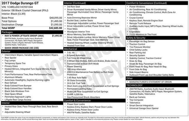 Turn every drive into something special with this Dodge Durango from Salt Lake Valley Chevrolet! Designed for comfort, performance, and style, this vehicle comes fully equipped with modern technology and convenience features youâll love. Plus, enjoy a $1,000 finance savings, already included in the sale price, when you finance through one of our trusted lending partners. If youâre shopping for used cars in Salt Lake City, or searching for the perfect SUV, truck, or sedan, this Dodge Durango delivers the dependability and value youâre looking for. Itâs the ideal match for your lifestyle - ready for everything from mountain adventures to city commutes. Visit Salt Lake Valley Chevrolet today and see why so many Utah drivers trust us for great deals on quality pre-owned vehicles. Explore our inventory online at www.slvchevy.com or call 801-969-8221 to schedule your test drive today! This impressive vehicle includes Nav & Power Liftgate Group (5-Year SiriusXM Traffic Service, 5-Year SiriusXM Travel Link Service, GPS Navigation, HD Radio, Power Liftgate, Radio: Uconnect 3C Nav w/8.4 Display, SiriusXM Traffic, and SiriusXM Travel Link), Quick Order Package 23E, 3.45 Rear Axle Ratio, 3rd row seats: split-bench, 4-Wheel Disc Brakes, 6 Speakers, 8.4 Touchscreen Display, ABS brakes, Air Conditioning, Alloy wheels, AM/FM radio: SiriusXM, Anti-whiplash front head restraints, Audio memory, Auto-dimming door mirrors, Auto-dimming Rear-View mirror, Automatic temperature control, Brake assist, Bumpers: body-color, Compass, Delay-off headlights, Driver door bin, Driver vanity mirror, Dual front impact airbags, Dual front side impact airbags, Electronic Stability Control, Emergency communication system: Uconnect Access, Exterior Parking Camera Rear, Four wheel independent suspension, Front anti-roll bar, Front Bucket Seats, Front Center Armrest w/Storage, Front dual zone A/C, Front fog lights, Front reading lights, Fully automatic headlights, Garage door transmitter, GPS Antenna Input, Heated door mirrors, Heated front seats, Heated rear seats, Heated steering wheel, Illuminated entry, Integrated Voice Command w/Bluetooth, Knee airbag, Leather Trimmed Bucket Seats, Low tire pressure warning, Manufacturer's Statement of Origin, Memory seat, Nav-Capable! See Dealer for Details, Occupant sensing airbag, Outside temperature display, Overhead airbag, Overhead console, Panic alarm, Passenger door bin, Passenger vanity mirror, Power door mirrors, Power driver seat, Power passenger seat, Power steering, Power windows, Radio data system, Radio: Uconnect 3C w/8.4 Display, Rear air conditioning, Rear anti-roll bar, Rear reading lights, Rear seat center armrest, Rear window defroster, Rear window wiper, Remote keyless entry, Roadside Assistance & 9-1-1 Call, Security system, Speed control, Speed-Sensitive Wipers, Split folding rear seat, Spoiler, Steering wheel mounted audio controls, Tachometer, Telescoping steering wheel, Tilt steering wheel, Traction control, Trip computer, Turn signal indicator mirrors, Variably intermittent wipers, and Wheels: 20 x 8.0 Premium Painted Aluminum, offering everything you need for your next adventure.