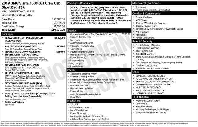 Turn every drive into something special with this GMC Sierra 1500 from Salt Lake Valley Chevrolet! Designed for comfort, performance, and style, this vehicle comes fully equipped with modern technology and convenience features youâll love. Plus, enjoy a $1,000 finance savings, already included in the sale price, when you finance through one of our trusted lending partners. If youâre shopping for used cars in Salt Lake City, or searching for the perfect SUV, truck, or sedan, this GMC Sierra 1500 delivers the dependability and value youâre looking for. Itâs the ideal match for your lifestyle - ready for everything from mountain adventures to city commutes. Visit Salt Lake Valley Chevrolet today and see why so many Utah drivers trust us for great deals on quality pre-owned vehicles. Explore our inventory online at www.slvchevy.com or call 801-969-8221 to schedule your test drive today! This impressive vehicle includes Driver Alert Package I (Lane Change Alert w/Side Blind Zone Alert, Perimeter Lighting, Rear Cross Traffic Alert, and Ultrasonic Front & Rear Park Assist), Driver Alert Package II (Following Distance Indicator, Forward Collision Alert, Front Pedestrian Braking, IntelliBeam Automatic High Beam On/Off, Lane Keep Assist w/Lane Departure Warning, Low Speed Forward Automatic Braking, and Safety Alert Seat), Preferred Equipment Group 4SA (12-Volt Rear Auxiliary Power Outlet, 120-Volt Bed Mounted Power Outlet, 120-Volt Instrument Panel Power Outlet, 170 Amp Alternator, Auxiliary External Transmission Oil Cooler, Chrome Grille, Color-Keyed Carpeting Floor Covering, Compass, Deep-Tinted Glass, Electric Rear-Window Defogger, Electrical Lock Control Steering Column, Front Frame-Mounted Black Recovery Hooks, GMC 4G LTE, GMC Connected Access, HD Radio, Heated Driver & Front Passenger Seating, Heavy-Duty Rear Locking Differential, Hitch Guidance, Hitch Guidance w/Hitch View, In-Vehicle Trailering App, Integrated Trailer Brake Controller, Keyless Open & Start, LED Cargo Area Lighting, Manual Tilt-Wheel & Telescoping Steering Column, OnStar & GMC Connected Services Capable, Power Door Locks, Power Front Passenger Windows w/Express Up/Down, Power Front Windows w/Driver Express Up/Down, Power Rear Windows w/Express Down, Rear Dual USB Charging-Only Ports, Rear Wheelhouse Liners, Remote Vehicle Starter System, Steering Wheel Audio Controls, and Theft Deterrent System (Unauthorized Entry)), SLT Convenience Package (2 USB Ports, 2 USB Ports (1st Row), Floor Mounted Console, Front Bucket Seats, Heated 2nd Row Outboard Seats, Power Sliding Rear Window w/Rear Defogger, Universal Home Remote, and Ventilated Driver & Front Passenger Seats), SLT Preferred Package (Premium Bose 7-Speaker Sound System, Radio: Premium GMC Infotainment Sys w/Navigation, SiriusXM Radio, and Wireless Charging), Texas Edition SLT Premium Plus Package (Chrome Assist Steps, Spray-On Pickup Bed Liner w/GMC Logo, Texas Edition Badging, and Trailer Tire Pressure Monitor System), Trailer Camera Package, Trailering Package, X31 Off-Road Package (Dual Exhaust w/Premium Tips, High-Capacity Air Filter, Hill Descent Control, and X31 Hard Badge), 10-Way Power Driver Seat Adjuster w/Lumbar, 10-Way Power Passenger Seat Adjuster w/Lumbar, 20 x 9 Polished Aluminum Wheels, 3.23 Rear Axle Ratio, 4-Wheel Disc Brakes, 6 Speakers, 6-Speaker Audio System Feature, ABS brakes, Air Conditioning, Alloy wheels, AM/FM radio: SiriusXM, Apple CarPlay/Android Auto, Auto-dimming door mirrors, Auto-dimming Rear-View mirror, Automatic temperature control, Brake assist, Bumpers: chrome, Delay-off headlights, Driver door bin, Driver Memory, Driver vanity mirror, Dual front impact airbags, Dual front side impact airbags, Electronic Stability Control, Front 40/20/40 Split-Bench Seat, Front anti-roll bar, Front Center Armrest w/Storage, Front dual zone A/C, Front fog lights, Front License Plate Kit, Front reading lights, Front wheel independent suspension,