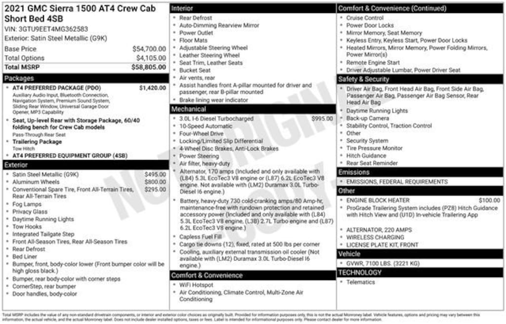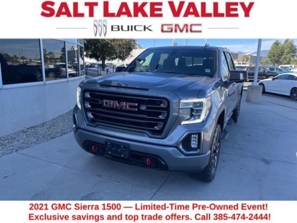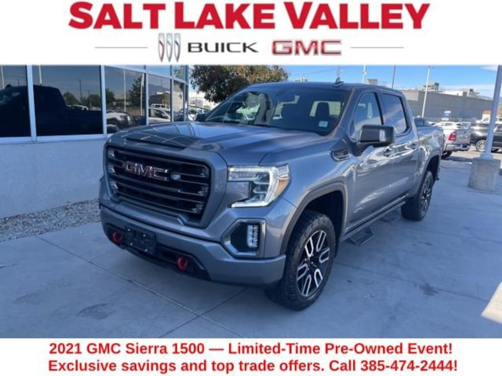 Take your drives to the next level with this GMC Sierra 1500 from Salt Lake Valley Buick GMC! Engineered for a smooth ride, advanced convenience, and lasting dependability, this vehicle is ready to handle everything your day throws at you. Plus, enjoy a $1,000 finance savings, already included in the sale price, when you finance through one of our trusted lending partners. Looking for quality used cars in Salt Lake City? This GMC Sierra 1500 delivers style, versatility, and value - perfect for daily commutes, family trips, or weekend adventures. Stop by Salt Lake Valley Buick GMC to see this vehicle in person and explore our wide selection of pre-owned cars, trucks, and SUVs. Browse online at www.slvbuickgmc.com or call 801-265-1511 to schedule your test drive today! With AT4 Preferred Package (Power Sliding Rear Window w/Rear Defogger, Premium Bose 7-Speaker Sound System, Radio: Premium GMC Infotainment Sys w/Navigation, SiriusXM w/360L, Universal Home Remote, and Wireless Charging), Preferred Equipment Group 4SB (12-Volt Rear Auxiliary Power Outlet, 120-Volt Bed Mounted Power Outlet, 120-Volt Instrument Panel Power Outlet, 170 Amp Alternator, 2 USB Ports, 2 USB Ports (1st Row), 4.2 Diagonal Color Display Driver Info Center, 4G LTE Wi-Fi Hotspot Capable, Auto-Locking Rear Differential, Auxiliary External Transmission Oil Cooler, Body-Color Surround Grille, Color-Keyed Carpeting Floor Covering, Compass, Deep-Tinted Glass, Electric Rear-Window Defogger, Electrical Lock Control Steering Column, Floor-Mounted Center Console, Front Prem Floor Liners w/Removable Carpet Insert, GMC Connected Access Capable, HD Rear Vision Camera, Heated Driver & Front Outboard Passenger Seating, Heavy-Duty Air Filter, Hill Descent Control, Hitch Guidance w/Hitch View, In-Vehicle Trailering App, Integrated Trailer Brake Controller, Keyless Open & Start, LED Cargo Area Lighting, Manual Tilt-Wheel & Telescoping Steering Column, OnStar & GMC Connected Services Capable, Power Door Locks, Power Front Passenger Windows w/Express Up/Down, Power Front Windows w/Driver Express Up/Down, Power Rear Windows w/Express Down, ProGrade Trailering System, Rear Dual USB Charging-Only Ports, Rear Prem Floor Liners w/Removable Carpet Insert, Rear Wheelhouse Liners, Red Recovery Hooks, Remote Vehicle Starter System, Spray-On Pickup Bed Liner w/AT4 Logo, Steering Wheel Audio Controls, Theft Deterrent System (Unauthorized Entry), and Ventilated Driver & Front Passenger Seats), Trailering Package (Hitch Guidance), 10-Way Power Driver Seat Adjuster w/Lumbar, 10-Way Power Passenger Seat Adjuster w/Lumbar, 18 x 8.5 Machined Aluminum Wheels, 220 Amp Alternator, 3.23 Rear Axle Ratio, 4-Wheel Disc Brakes, 6 Speakers, 6-Speaker Audio System Feature, ABS brakes, Air Conditioning, Alloy wheels, AM/FM radio: SiriusXM with 360L, Apple CarPlay/Android Auto, Auto-dimming door mirrors, Auto-dimming Rear-View mirror, Automatic temperature control, Brake assist, Bumpers: body-color, Delay-off headlights, Driver door bin, Driver Memory, Driver vanity mirror, Dual front impact airbags, Dual front side impact airbags, Electronic Stability Control, Engine Block Heater, Front anti-roll bar, Front Bucket Seats, Front Center Armrest, Front dual zone A/C, Front fog lights, Front License Plate Kit, Front reading lights, Front wheel independent suspension, Fully automatic headlights, Heated 2nd Row Outboard Seats, Heated door mirrors, Heated front seats, Heated steering wheel, Illuminated entry, Low tire pressure warning, Memory seat, Occupant sensing airbag, Off-Road Suspension, Outside temperature display, Overhead airbag, Overhead console, Panic alarm, Passenger door bin, Passenger vanity mirror, Perforated Leather-Appointed Front Seat Trim, Power door mirrors, Power driver seat, Power passenger seat, Power steering, Power windows, Premium audio system: GMC Infotainment System, Radio data system, Radio: Premium GMC Infotainment Sys w/Multi-Touch,
