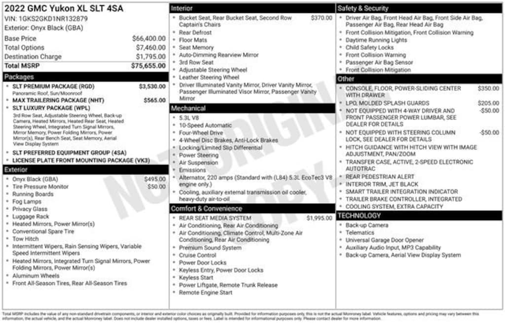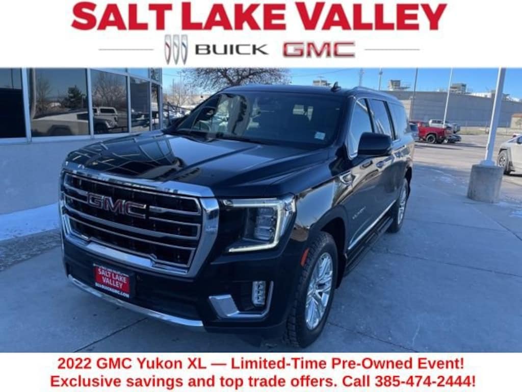 Take your drives to the next level with this GMC Yukon XL from Salt Lake Valley Buick GMC! Engineered for a smooth ride, advanced convenience, and lasting dependability, this vehicle is ready to handle everything your day throws at you. Plus, enjoy a $1,000 finance savings, already included in the sale price, when you finance through one of our trusted lending partners. Looking for quality used cars in Salt Lake City? This GMC Yukon XL delivers style, versatility, and value - perfect for daily commutes, family trips, or weekend adventures. Stop by Salt Lake Valley Buick GMC to see this vehicle in person and explore our wide selection of pre-owned cars, trucks, and SUVs. Browse online at www.slvbuickgmc.com or call 801-265-1511 to schedule your test drive today! With License Plate Front Mounting Package, Max Trailering Package, Preferred Equipment Group 4SA (2 Presets For Power Driver Seat, Automatic Stop/Start, Bose 9-Speaker Stereo Audio System Feature, Bright Chrome Bodyside Moldings, Bright Front & Rear Door Sill Plates, Chrome Door Handles w/Body-Color Strip, Hands-Free Power Programmable Rear Liftgate, Heated & Ventilated Driver & Front Passenger Seats, Heated Driver & Front Passenger Seats, Inside Rear-View Auto-Dimming Mirror, Safety Alert Seat, Start/Stop System Disable Button, Universal Home Remote, and Wireless Charging), SLT Luxury Package (2 Presets For Outside Rearview Mirrors, 3rd Row 60/40 Power-Folding Split-Bench Seat, HD Surround Vision, Heated 2nd Row Outboard Position Seats, Heated Steering Wheel, Outside Heated Power-Adjustable Mirrors, Power Release 2nd Row 60/40 Split-Folding Bench Seat, Power Tilt & Telescopic Steering Column, and Rear Pedestrian Alert), SLT Premium Package (Dual-Pane Panoramic Power Sunroof), 3.23 Rear Axle Ratio, 3rd row seats: split-bench, 4-Wheel Disc Brakes, 9 Speakers, ABS brakes, Air Conditioning, Alloy wheels, AM/FM radio: SiriusXM with 360L, AM/FM Stereo, Apple CarPlay/Android Auto, Auto High-beam Headlights, Auto-dimming Rear-View mirror, Automatic Emergency Braking, Automatic temperature control, Bodyside moldings, Brake assist, Bumpers: body-color, Compass, Delay-off headlights, Driver door bin, Driver vanity mirror, Dual front impact airbags, Dual front side impact airbags, Electronic Stability Control, Emergency communication system: OnStar and GMC Connected Services capable, Extra Capacity Cooling System, Floor Console, Following Distance Indicator, Forward Collision Alert, Four wheel independent suspension, Front & Rear Park Assist, Front anti-roll bar, Front Bucket Seats, Front Center Armrest, Front dual zone A/C, Front fog lights, Front Pedestrian Braking, Front reading lights, Fully automatic headlights, Garage door transmitter, Heated door mirrors, Heated front seats, Hitch Guidance w/Hitch View, Illuminated entry, Integrated Trailer Brake Controller, IntelliBeam Automatic High Beam On/Off, Lane Change Alert w/Side Blind Zone Alert, Lane Keep Assist w/Lane Departure Warning, Leather steering wheel, Low tire pressure warning, Memory seat, Molded Splash Guards, Navigation System, Not Equipped w/4-Way Driver & Fr Pass Pwr Lumbar, Not Equipped w/Steering Column Lock, Occupant sensing airbag, Outside temperature display, Overhead airbag, Overhead console, Panic alarm, Passenger door bin, Passenger vanity mirror, Perforated Leather-Appointed Seating, Power door mirrors, Power driver seat, Power Liftgate, Power passenger seat, Power Release 2nd Row Bucket Seats, Power steering, Power windows, Premium Smooth Ride Suspension, Rain sensing wipers, Rear air conditioning, Rear anti-roll bar, Rear Cross Traffic Alert, Rear reading lights, Rear seat center armrest, Rear Seat Media System (DISC), Rear window defroster, Rear window wiper, Remote keyless entry, Roof rack: rails only, Security system, SiriusXM w/360L, Smart Trailer Integration Indicator, Speed control, Speed-sensing steering, Split folding rear seat, Spoiler, Steering wheel mounted audio controls, Tachometer, Telescop