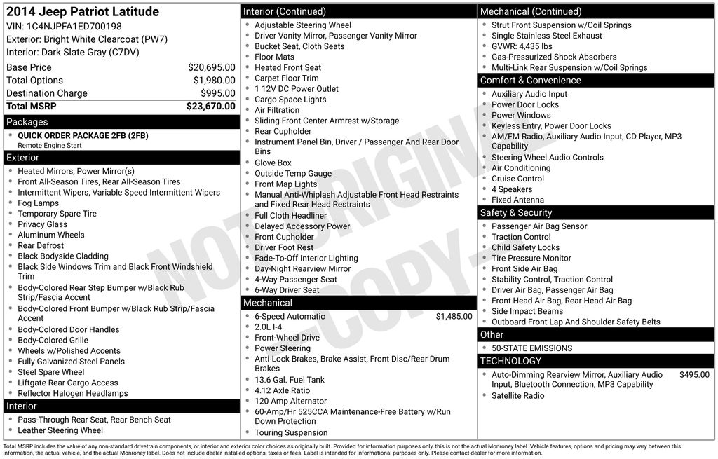 Bright White Clearcoat 2014 Jeep Patriot Latitude FWD 6-Speed Automatic 2.0L I4 DOHC 16V Dual VVT Dark Slate Gray Cloth.