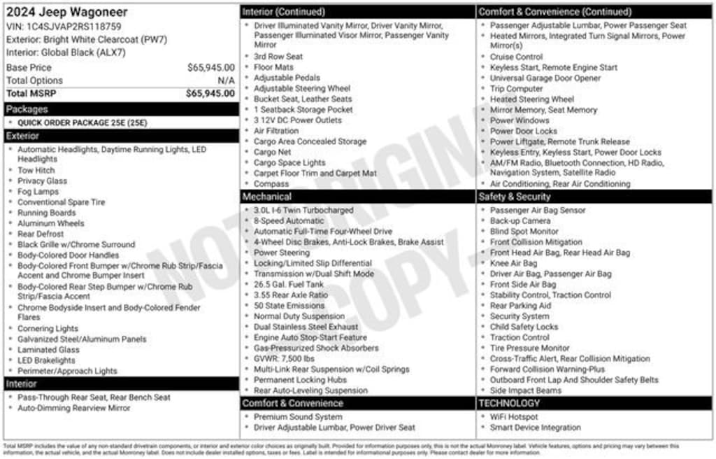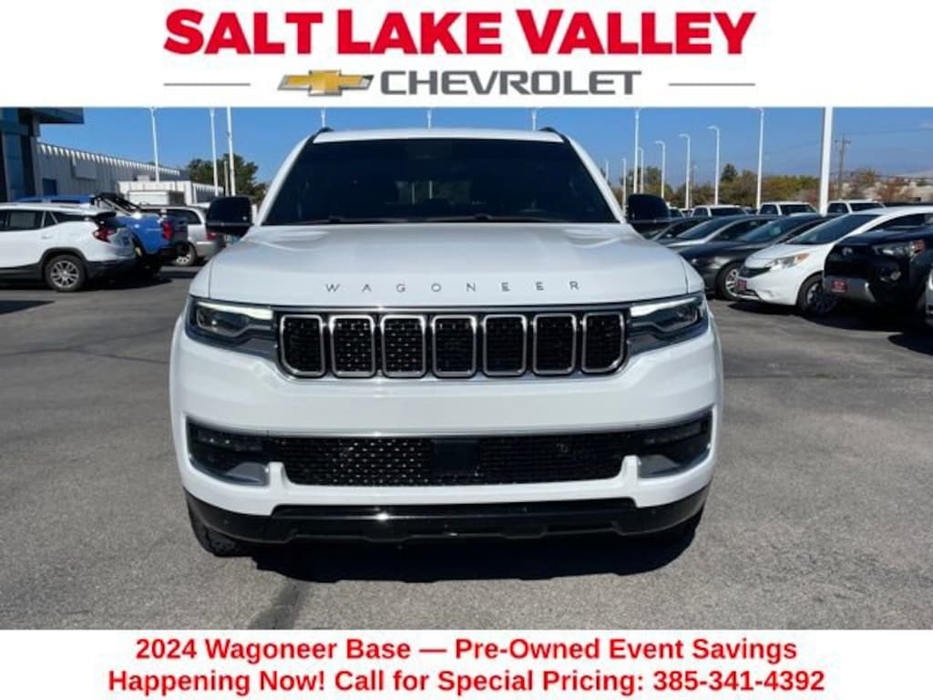 Turn every drive into something special with this Jeep Wagoneer from Salt Lake Valley Chevrolet! Designed for comfort, performance, and style, this vehicle comes fully equipped with modern technology and convenience features youâll love. Plus, enjoy a $1,000 finance savings, already included in the sale price, when you finance through one of our trusted lending partners. If youâre shopping for used cars in Salt Lake City, or searching for the perfect SUV, truck, or sedan, this Jeep Wagoneer delivers the dependability and value youâre looking for. Itâs the ideal match for your lifestyle - ready for everything from mountain adventures to city commutes. Visit Salt Lake Valley Chevrolet today and see why so many Utah drivers trust us for great deals on quality pre-owned vehicles. Explore our inventory online at www.slvchevy.com or call 801-969-8221 to schedule your test drive today! This impressive vehicle includes Quick Order Package 25E, 10 Speakers, 3.55 Rear Axle Ratio, 3rd row seats: bench, 4-Wheel Disc Brakes, ABS brakes, Adjustable pedals, Air Conditioning, Alloy wheels, AM/FM radio: SiriusXM with 360L, Anti-whiplash front head restraints, Apple CarPlay/Android Auto, Audio memory, Auto-dimming door mirrors, Auto-dimming Rear-View mirror, Auto-leveling suspension, Automatic temperature control, Brake assist, Bumpers: body-color, Compass, Delay-off headlights, Driver door bin, Driver vanity mirror, Driver's Seat Mounted Armrest, Dual front impact airbags, Dual front side impact airbags, Electronic Stability Control, Emergency communication system: Wagoneer Connect, Exterior Parking Camera Rear, Four wheel independent suspension, Front anti-roll bar, Front Bucket Seats, Front Center Armrest w/Storage, Front dual zone A/C, Front fog lights, Front reading lights, Fully automatic headlights, Garage door transmitter, Heated door mirrors, Heated front seats, Heated steering wheel, Illuminated entry, Knee airbag, Leather Trimmed Bucket Seats, Low tire pressure warning, Memory seat, Navigation System, Normal Duty Suspension, Occupant sensing airbag, Outside temperature display, Overhead airbag, Overhead console, Panic alarm, Passenger door bin, Passenger seat mounted armrest, Passenger vanity mirror, Pedal memory, Power adjustable front head restraints, Power door mirrors, Power driver seat, Power Liftgate, Power passenger seat, Power steering, Power windows, Radio data system, Radio: Uconnect 5 Nav w/10.1 Display, Rear air conditioning, Rear anti-roll bar, Rear dual zone A/C, Rear reading lights, Rear seat center armrest, Rear window defroster, Rear window wiper, Reclining 3rd row seat, Remote keyless entry, Security system, Speed control, Speed-sensing steering, Speed-Sensitive Wipers, Split folding rear seat, Steering wheel memory, Steering wheel mounted audio controls, Tachometer, Telescoping steering wheel, Tilt steering wheel, Traction control, Trip computer, Turn signal indicator mirrors, Variably intermittent wipers, Ventilated front seats, Voltmeter, and Wheels: 18 x 8.0 Aluminum Base Finish, offering everything you need for your next adventure.