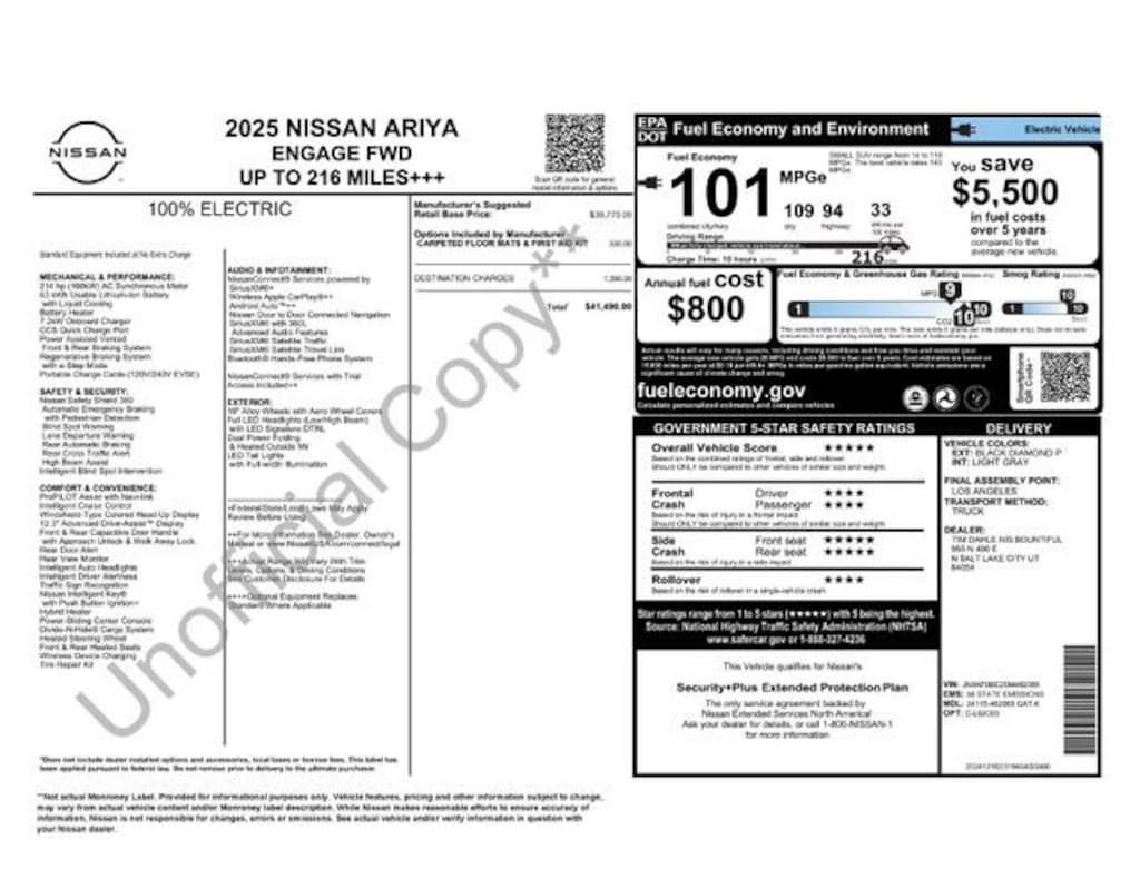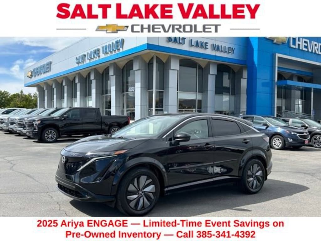This Nissan Ariya is packed with all your favorite features and includes a $1,000 finance savings, already included into the sale price, when you finance through one of our trusted lending partners! Explore more quality vehicles at www.slvchevrolet.com or call 801-969-8221 today! Enjoy the great options on this Ariya like 19 Alloy Wheels, 4-Wheel Disc Brakes, 6 Speakers, ABS brakes, Air Conditioning, Alloy wheels, AM/FM radio: SiriusXM, Auto High-beam Headlights, Automatic temperature control, Brake assist, Bumpers: body-color, Carpeted Floor Mats & First Aid Kit, Delay-off headlights, Driver door bin, Driver vanity mirror, Dual front impact airbags, Dual front side impact airbags, Electronic Stability Control, Emergency communication system: NissanConnect EV & Services, Four wheel independent suspension, Front anti-roll bar, Front Bucket Seats, Front Center Armrest, Front dual zone A/C, Front reading lights, Heads-Up Display, Heated door mirrors, Heated Front Bucket Seats, Heated front seats, Heated rear seats, Heated steering wheel, Illuminated entry, Knee airbag, Leather steering wheel, Leatherette Seating Surfaces, Low tire pressure warning, Memory seat, Navigation system: Nissan Door to Door Connected Navigation, Occupant sensing airbag, Outside temperature display, Overhead airbag, Panic alarm, Passenger door bin, Passenger vanity mirror, Power door mirrors, Power driver seat, Power steering, Power windows, Radio: NissanConnect EV w/Navigation, Rear anti-roll bar, Rear reading lights, Rear seat center armrest, Rear side impact airbag, Rear window defroster, Rear window wiper, Remote keyless entry, Security system, Speed control, Speed-sensing steering, Speed-Sensitive Wipers, Split folding rear seat, Spoiler, Steering wheel mounted audio controls, Telescoping steering wheel, Tilt steering wheel, Traction control, Trip computer, and Variably intermittent wipers.