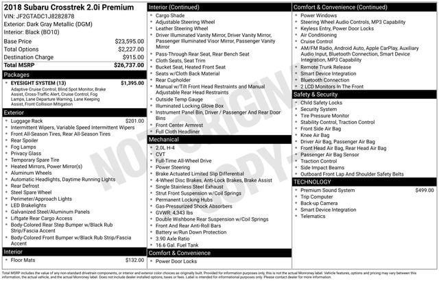 Turn every drive into something special with this Subaru Crosstrek from Salt Lake Valley Chevrolet! Designed for comfort, performance, and style, this vehicle comes fully equipped with modern technology and convenience features youâll love. Price excludes tax, title, license fee, government fees, and $449 dealer documentary service fee. While every reasonable effort is made to ensure accuracy, we are not responsible for errors or omissions, and vehicles may be sold prior to inquiry please contact the dealer to confirm availability. All financing is subject to approved credit. If youâre shopping for used cars in Salt Lake City, or searching for the perfect SUV, truck, or sedan, this Subaru Crosstrek delivers the dependability and value youâre looking for. Itâs the ideal match for your lifestyle - ready for everything from mountain adventures to city commutes. Visit Salt Lake Valley Chevrolet today and see why so many Utah drivers trust us for great deals on quality pre-owned vehicles. Explore our inventory online at www.slvchevy.com or call 801-969-8221 to schedule your test drive today! This impressive vehicle includes EyeSight System (Blind Spot Detection/Rear Cross Traffic Alert), 17 x 7.0J Aluminum Alloy Wheels, 3.90 Axle Ratio, 4-Wheel Disc Brakes, 6 Speakers, ABS brakes, Adaptive Cruise Control, Aero Cross Bar Set, Air Conditioning, All-Weather Floor Liners, Alloy wheels, AM/FM radio, Apple CarPlay/Android Auto, Brake assist, Bumpers: body-color, Charge-Coupled Device Cameras, Cloth Upholstery, Driver door bin, Driver vanity mirror, Dual front impact airbags, Dual front side impact airbags, Electronic Stability Control, Emergency communication system: STARLINK, Exterior Parking Camera Rear, Four wheel independent suspension, Front anti-roll bar, Front Bucket Seats, Front Center Armrest, Front fog lights, Front reading lights, Fully automatic headlights, Heated door mirrors, Heated Front Bucket Seats, Heated front seats, Illuminated entry, Knee airbag, Lane Keep Assist, Leather Shift Knob, Low tire pressure warning, Occupant sensing airbag, Outside temperature display, Overhead airbag, Overhead console, Panic alarm, Passenger door bin, Passenger vanity mirror, Power door mirrors, Power steering, Power windows, Pre-Collision Brake Assist, Pre-Collision Braking System, Pre-Collision Following Distance Warning, Radio data system, Radio: Subaru Starlink 6.5 Multimedia System, Rear anti-roll bar, Rear window defroster, Rear window wiper, Remote keyless entry, Rockford Fosgate Audio Upgrade, Roof rack: rails only, Security system, Speed control, Speed-sensing steering, Split folding rear seat, Spoiler, Steering Responsive Fog Lights, Steering wheel mounted audio controls, Subaru Starlink Smartphone Integration, Tachometer, Telescoping steering wheel, Tilt steering wheel, Traction control, Trip computer, and Variably intermittent wipers, offering everything you need for your next adventure.27/33 City/Highway MPGCARFAX One-Owner.Awards:* ALG Residual Value Awards, Residual Value Awards * 2018 KBB.com 5-Year Cost to Own Awards * 2018 KBB.com 10 Best All-Wheel-Drive Vehicles Under $25,000 * 2018 KBB.com 10 Most Awarded Brands * 2018 KBB.com Brand Image Awards