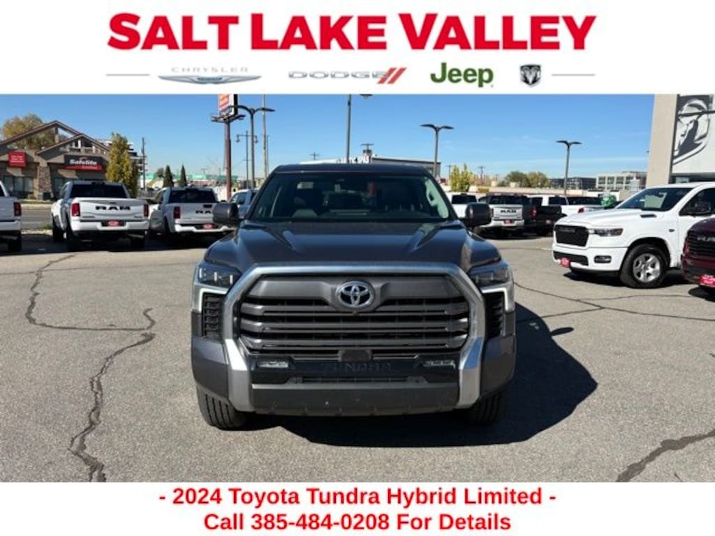 Get ready to hit the road in this Toyota Tundra Hybrid, a standout choice for drivers looking for reliability, performance, and style! This impressive vehicle is packed with premium features designed to make every drive more enjoyable. Plus, youâll enjoy a $1,000 finance savings, already included in the sale price, when you finance through one of our trusted lending partners. Whether youâre searching for used cars in Salt Lake City, a dependable SUV, or a powerful truck, this Toyota Tundra Hybrid delivers everything you need and more. Visit Salt Lake Valley Chrysler Dodge Jeep Ram today to test drive or explore our entire selection of quality pre-owned vehicles. Donât wait - shop online at www.slvcdjr.com or call 801-484-8755 to learn more! This amazing vehicle comes loaded with options like 20" x 8" Alloy Wheels, 3.31 Axle Ratio, 4-Wheel Disc Brakes, 9 Speakers, ABS brakes, Air Conditioning, Alloy wheels, AM/FM radio: SiriusXM, Apple CarPlay/Android Auto, Auto High-beam Headlights, Auto-dimming door mirrors, Auto-dimming Rear-View mirror, Automatic temperature control, Brake assist, Bumpers: body-color, Delay-off headlights, Driver door bin, Driver vanity mirror, Dual front impact airbags, Dual front side impact airbags, Electronic Stability Control, Emergency communication system: Safety Connect (10-year trial), Exterior Parking Camera Rear, Front anti-roll bar, Front Bucket Seats, Front Center Armrest, Front dual zone A/C, Front fog lights, Front reading lights, Front wheel independent suspension, Fully automatic headlights, Garage door transmitter: HomeLink, Heated & Ventilated Front Bucket Seats, Heated door mirrors, Heated front seats, Heated steering wheel, Illuminated entry, Knee airbag, Leather Shift Knob, Low tire pressure warning, Memory seat, Navigation System, Occupant sensing airbag, Outside temperature display, Overhead airbag, Overhead console, Panic alarm, Passenger door bin, Passenger vanity mirror, Power door mirrors, Power driver seat, Power passenger seat, Power steering, Power windows, Radio data system, Radio: Audio Plus, Radio: Premium Audio w/JBL, Rear reading lights, Rear seat center armrest, Rear step bumper, Rear window defroster, Remote keyless entry, Security system, SofTex Seat Trim, Speed control, Speed-sensing steering, Split folding rear seat, Steering wheel mounted audio controls, Tachometer, Telescoping steering wheel, Tilt steering wheel, Traction control, Trip computer, Turn signal indicator mirrors, Variably intermittent wipers, Ventilated front seats, and Voltmeter, making it the perfect choice for your next adventure. Priced below KBB Fair Purchase Price!